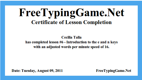 During the time we do our typing lesson's, if we complete our lesson we get a certificate for completing it. I like to earn a certificate so, I can show my teacher that I have evidence of my learning. This is a thing that I like to do because I want people to know, that I have been doing my work during class time and my own time. I really like having typing lesson's!